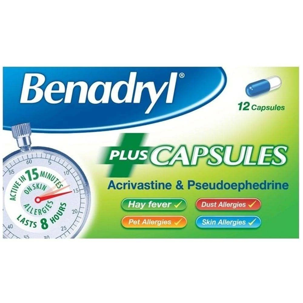 Benadryl Plus Capsules is a medication that is used to treat hay fever and other allergic conditions. Pseudoephedrine hydrochloride, a decongestant that relieves nasal and sinus congestion, and acrivastine, an antihistamine that relieves allergy symptoms such as sneezing, runny nose, and watery eyes, are both contained in the capsules.