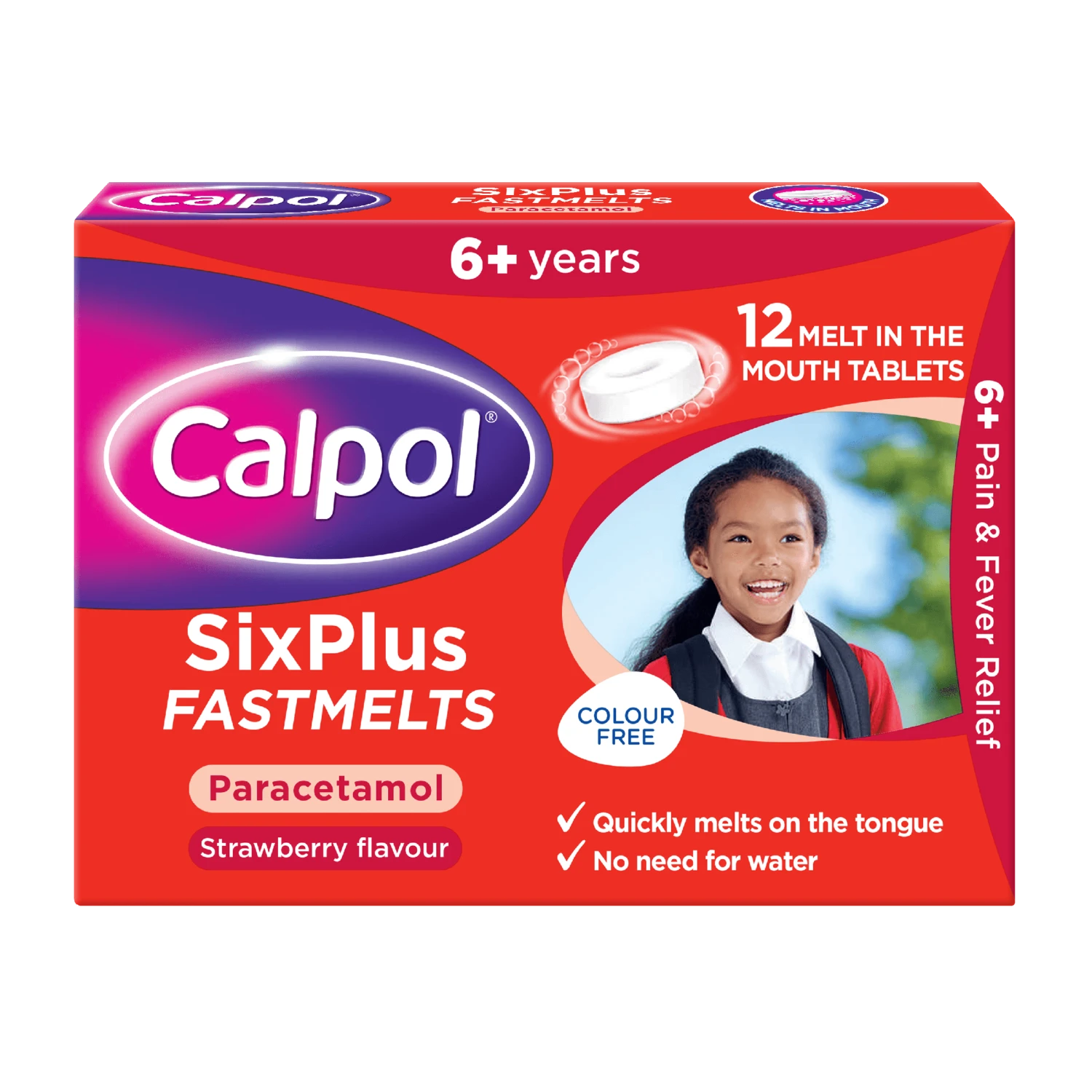Calpol Six Plus Fastmelts are strawberry-flavoured tablets that are used to treat pain and/or fever in a variety of conditions such as cold and flu, headache, toothache, earache, post-immunization fever, sore throat, and other aches and pains.