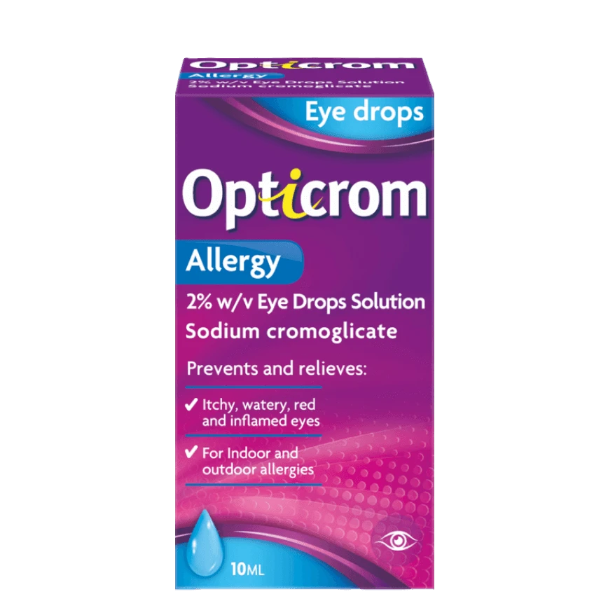 Opticrom Allergy Eye Drops 10ml is a sterile, clear, and colorless solution containing the active ingredient sodium cromoglicate. It works by inhibiting the release of histamine, a substance that causes allergic reactions, in the eyes.